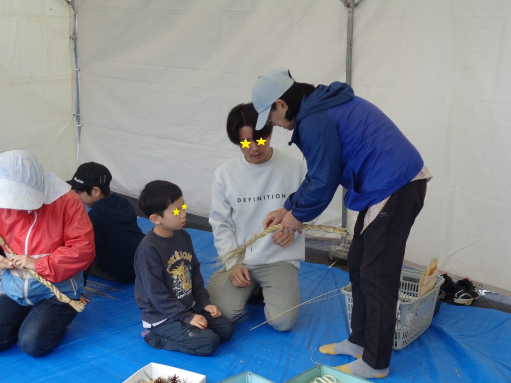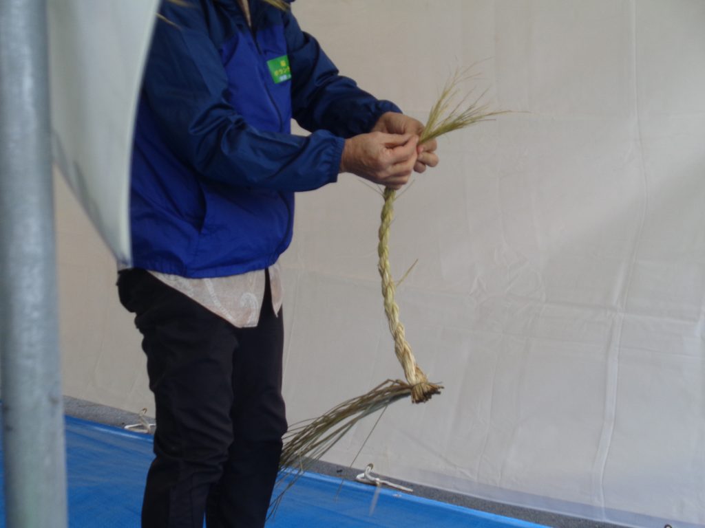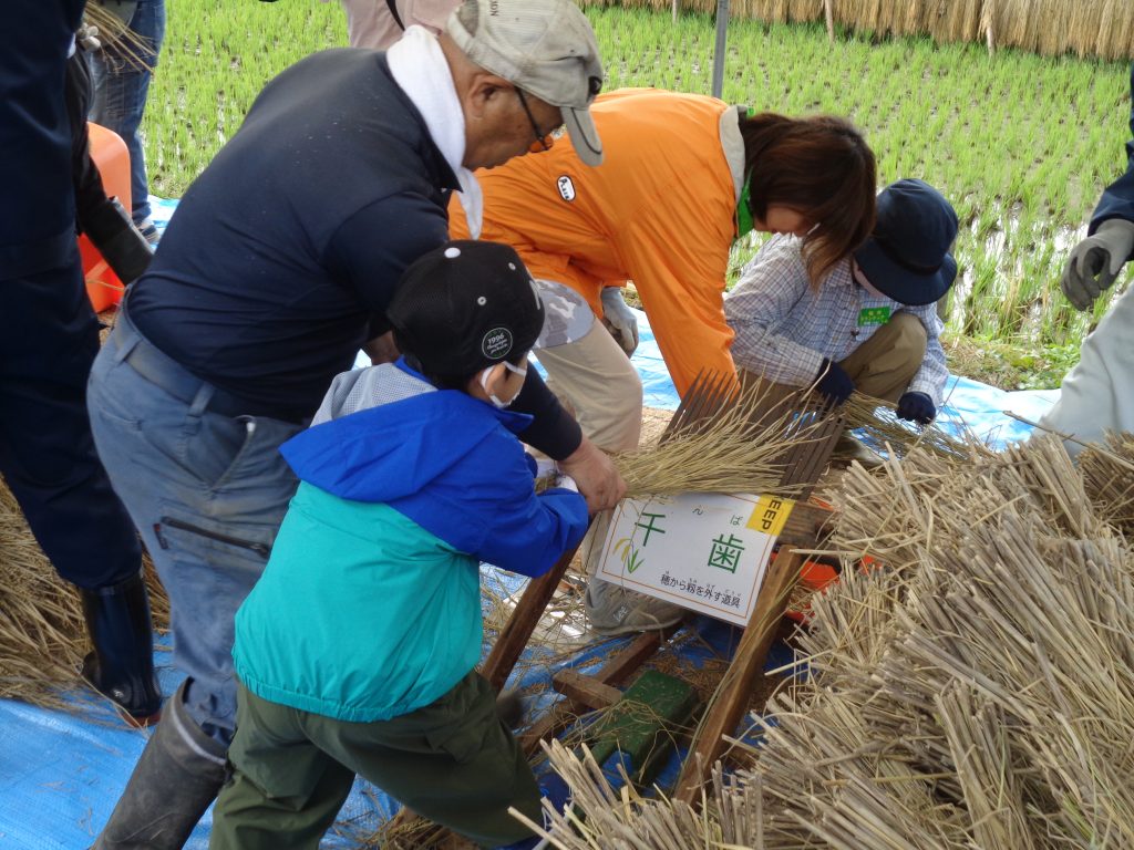 イベント当日は気持ちの良い日となりましたが、前日の夜間の雨で田んぼは水浸し。泣く泣く体験は縮小版で千歯、足踏み脱穀機と縄ないの体験を行いました。